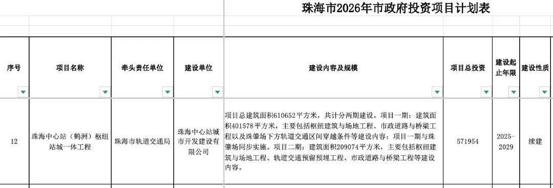 珠海市发展和改革局在近日公布了《珠海市2026年市政府投资项目计划》,珠海中心站(鹤洲)枢纽站城一体工程项目总建筑面积610652平方米,共计分两期建设。