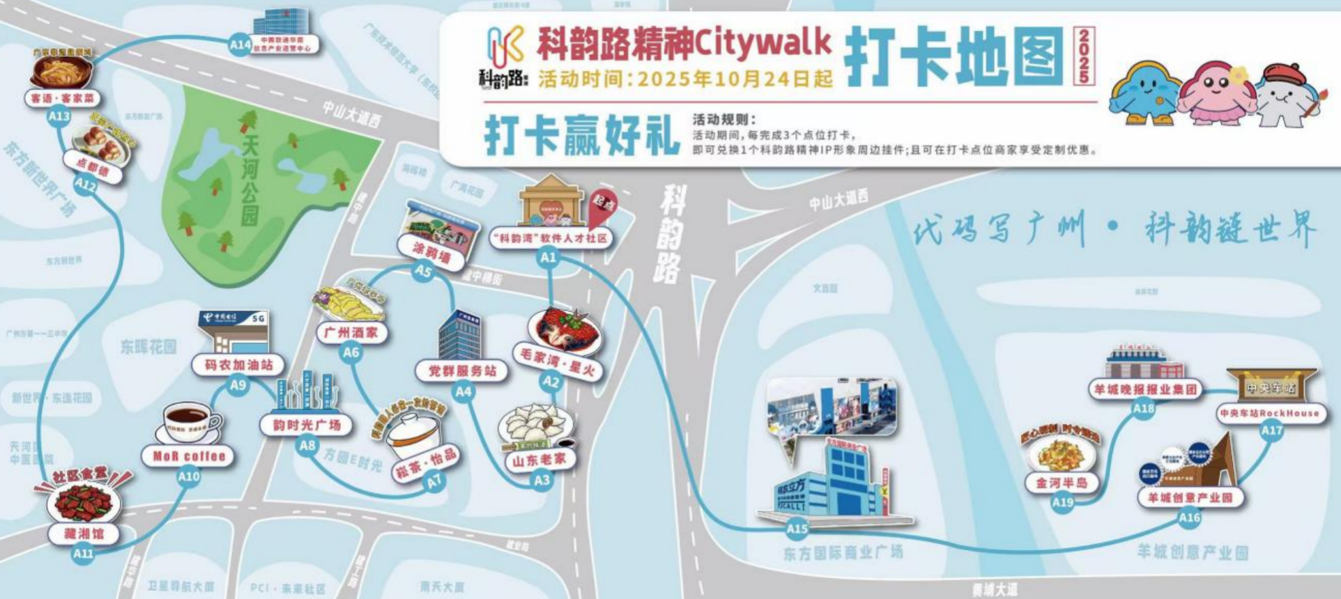 线路从科韵湾软件人才社区出发,贯穿东方新世界广场、中国联通华南信息产业运营中心、羊城创意产业园、东方国际商业广场,全程约4公里,共设置19个特色打卡点位。