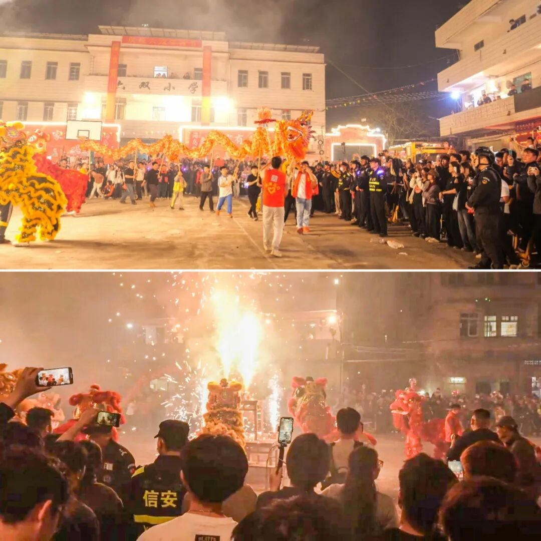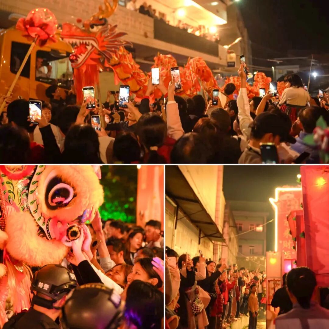 长长的巡游队伍沿着村中主干道蜿蜒前行,途经之处,家家户户燃放烟花爆竹迎接,场面热烈,沿途观众络绎不绝,争相观看。巡游结束后,队伍返回起点,围成圆圈上演斗龙表演,现场欢呼不断,气氛达到高潮。