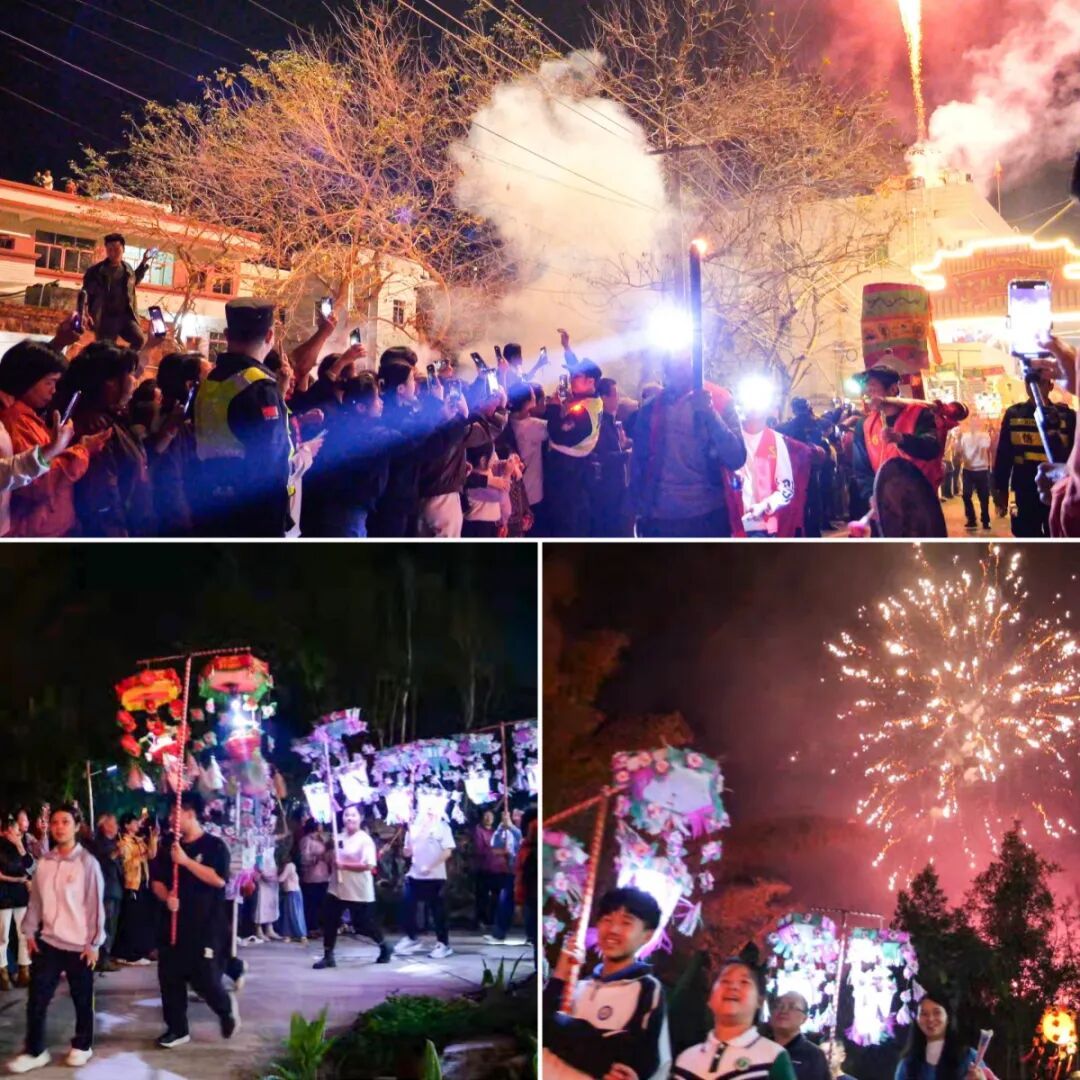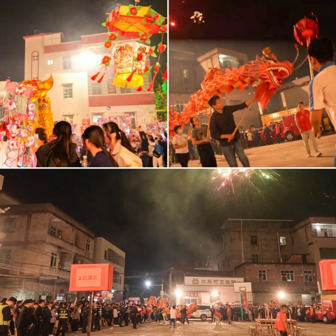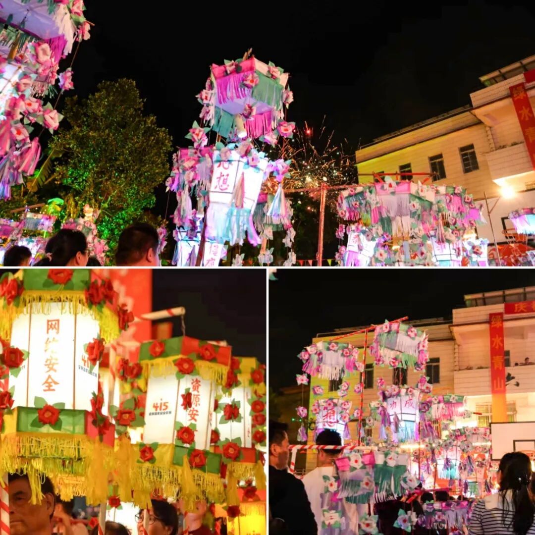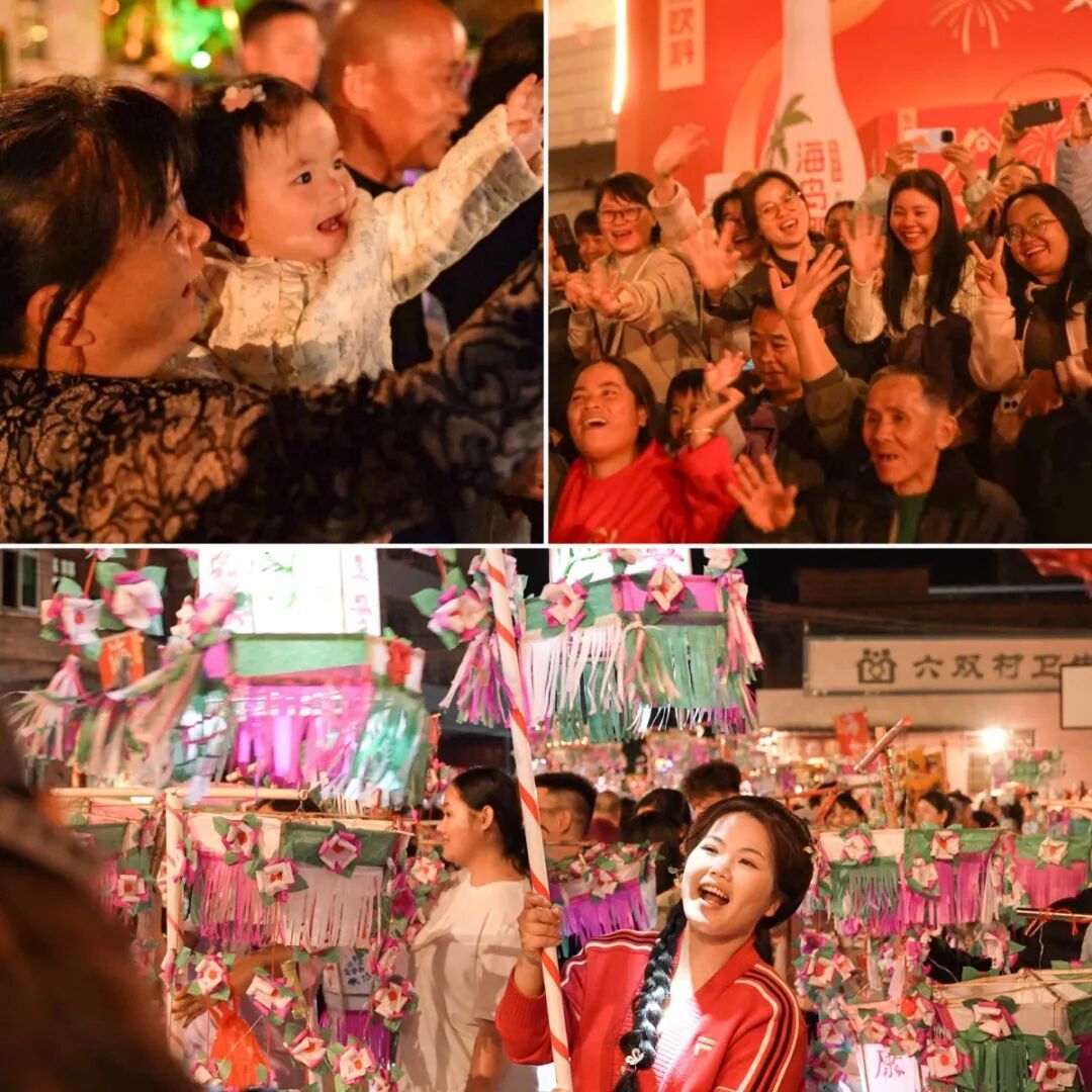 这些花灯均由当地村民手工制作,就地取材,以竹篾为骨架,宣纸为灯面,灯上写有祝福语,内置烛火,每一盏都独具特色。“国泰民安”“添丁进财”“吉祥如意”等朴素而真诚的祝福通过一盏盏花灯得以传递,展现了六双村民对美好生活的向往。现场烟花璀璨,花灯流光溢彩,锣鼓声、鞭炮声、欢笑声此起彼伏。