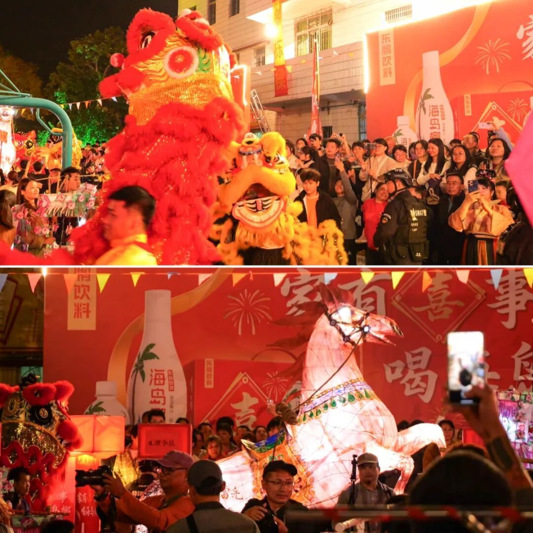 当晚八时许,巡游正式拉开帷幕。两面大铜锣开道,寓意马年吉祥、一马当先的马形大型花灯作为队伍前导,随后是各式各样、造型各异的花灯方队。巡游队伍中,舞龙随着锣鼓节奏起伏翻腾,时左时右,动作灵活。各村方阵多以舞狮为先导,紧随其后的是手持火把的村民以及各家各户自制的花灯。整支巡游队伍蜿蜒而行,场面壮观。