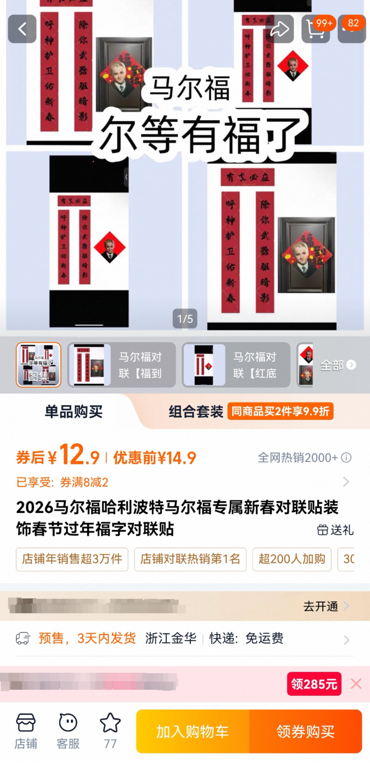 除了春联之外,电商平台上还出现了贴纸、冰箱贴、“吧唧”(徽章)等“马尔福”周边,誓将“马年”福气立刻送到尔等周边。